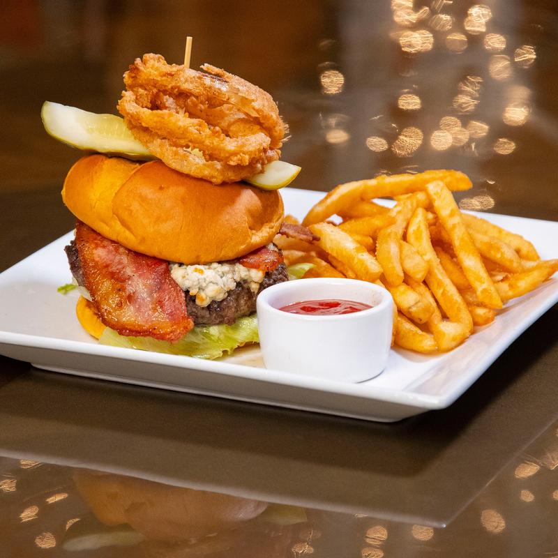 Ground angus beef char-grilled, toasted brioche bun, garlic herb aioli, barbeque sauce, iceberg lettuce, bleu cheese, tomato, topped with crispy onion rings and served with fries • Bacon +$2.50 | Mushrooms +$2.00