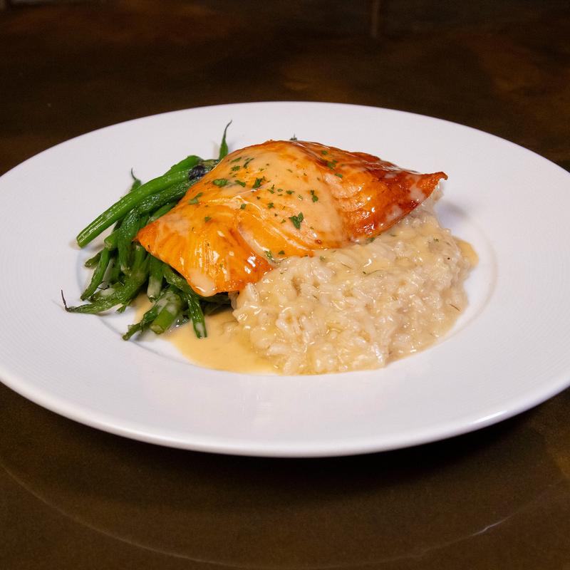Oven roasted cedar-baked salmon served with risotto, sauteed seasonal vegetables and topped with signature beurre blanc sauce