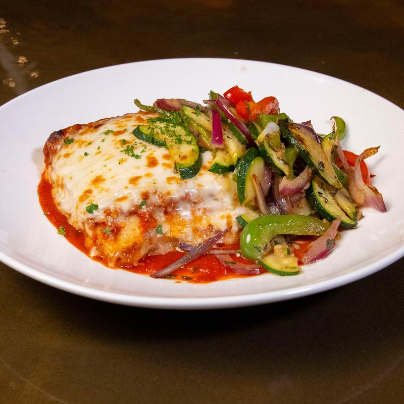 Enjoy layers of tender pasta, savory meat sauce, alfredo and creamy ricotta, cottage cheese, topped with mozzarella and baked in the oven to perfection, served with a side of sauteed veggies