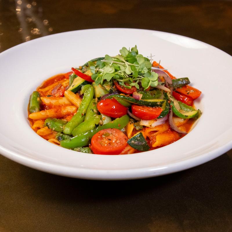 Sautéed zucchini, asparagus, bell peppers, onions, cherry tomatoes, garlic and herbs served over penne pasta and our house marinara