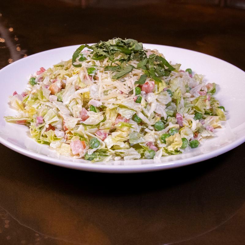 Small $10.50 | Large $20.00 • Chopped iceberg lettuce, mozzarella, peas, tomato, salami, roasted chicken, creamy Italian vinaigrette, basil, parmesan