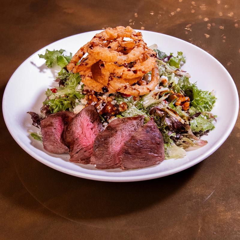 CAB 8 oz. petite tender steak grilled, sliced over tossed mixed greens, creamy Italian dressing, blue cheese crumbles, candied walnuts, cherry tomatoes, tobacco onions, and balsamic glaze