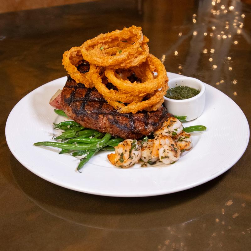 Coffee rubbed 12oz rib eye, grilled and served with roasted harissa potatoes, seasonal vegetables, topped with crispy onion rings and a side of chimichurri • Prawns (5) +$6.50 | Sautéed Mushrooms +$5.00