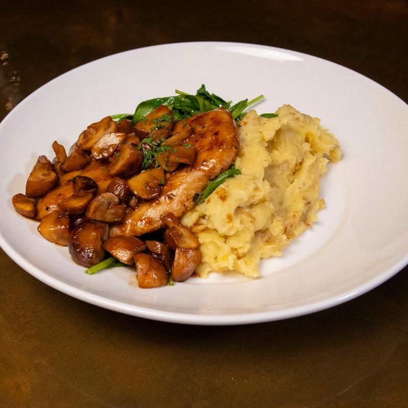 Pan-seared chicken breast topped with our signature house marsala sauce, sauteed mushrooms, served over spinach and garlic mashed potatoes