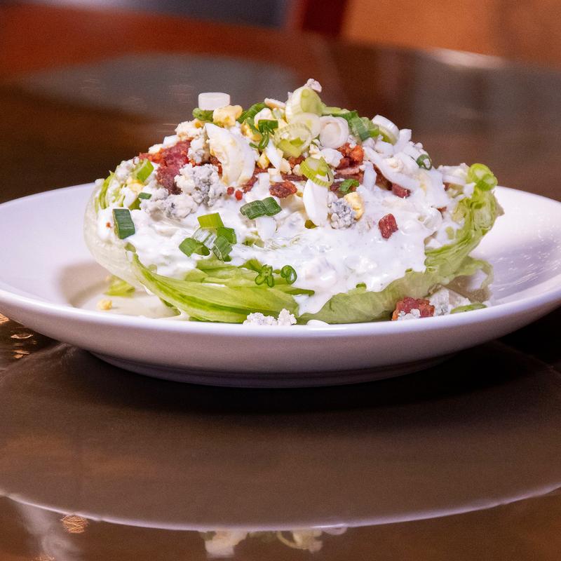 Small $9.00 | Large $17.00 • Crisp iceberg lettuce topped with bacon, bleu cheese crumbles, boiled egg, scallions, and bleu cheese dressing