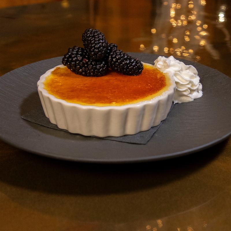 Classic custard with a caramelized sugar crust, topped with whipped cream
